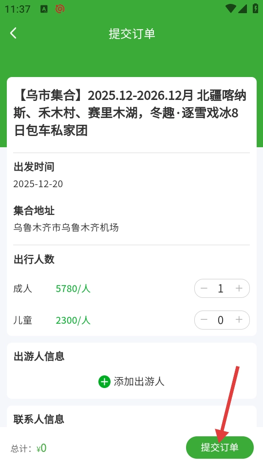 在提交订单页面,确认好出发时间、集合地点、出行人数等信息后,点击【提交订单】按钮,就能完成报名流程了。