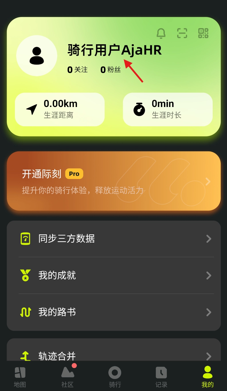 打开际刻骑行应用,进入地图页面后,找到右下角的“我的”选项并点击,即可跳转至个人界面。