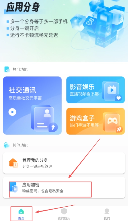 完成登录操作后,系统会自动跳转到软件首页,在首页的功能模块里找到标有“应用加密”的选项,点击该选项即可进入应用加密的设置界面。