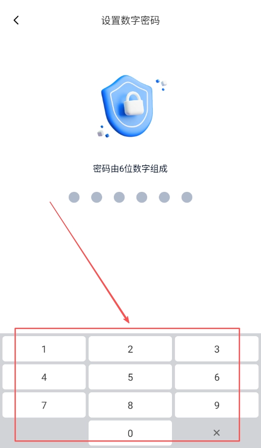 进入密码设置环节后,根据界面提示在指定输入区域输入六位数字作为加密密码,输入完成后就能完成应用加密的密码设置操作。