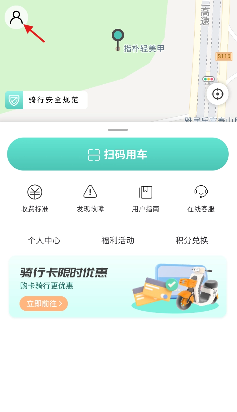 通过地图定位周边车辆,点击扫码功能扫描对应二维码,验证成功后就能解锁使用车辆。