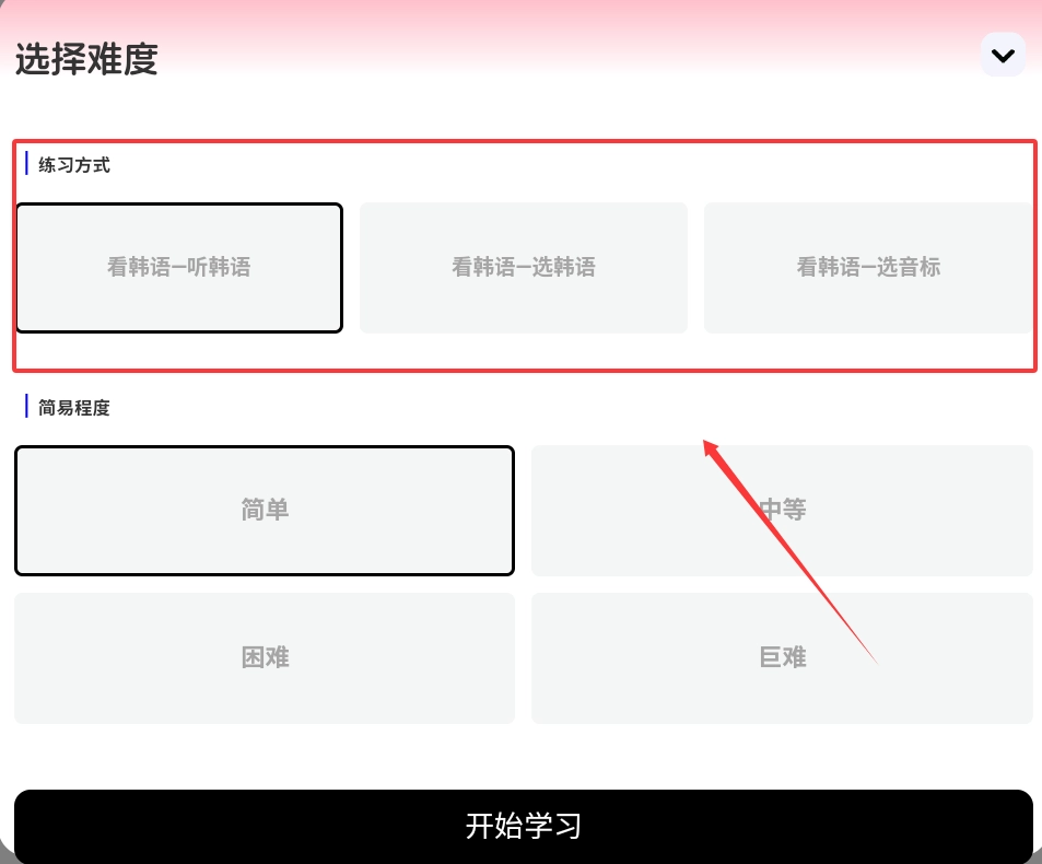 进入练习模式。点击需要练习的选项,进入后即可开始学习。
