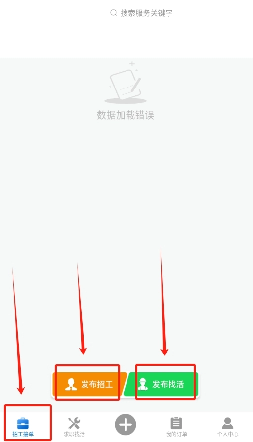 登录成功后回到软件首页,若你想找工作,点击 “发布找活”;若要招人,点击 “发布招工”,开启你的用工求职之旅。