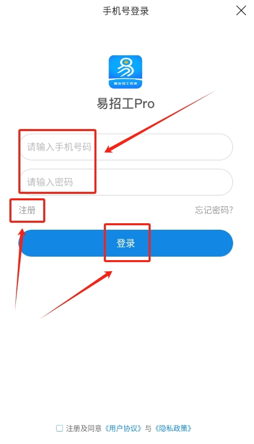 打开易招工pro软件,在登录界面找到手机号输入框,输入对应的号码后,点击“获取验证码”按钮,待收到验证码后将其填入,即可完成登录操作。