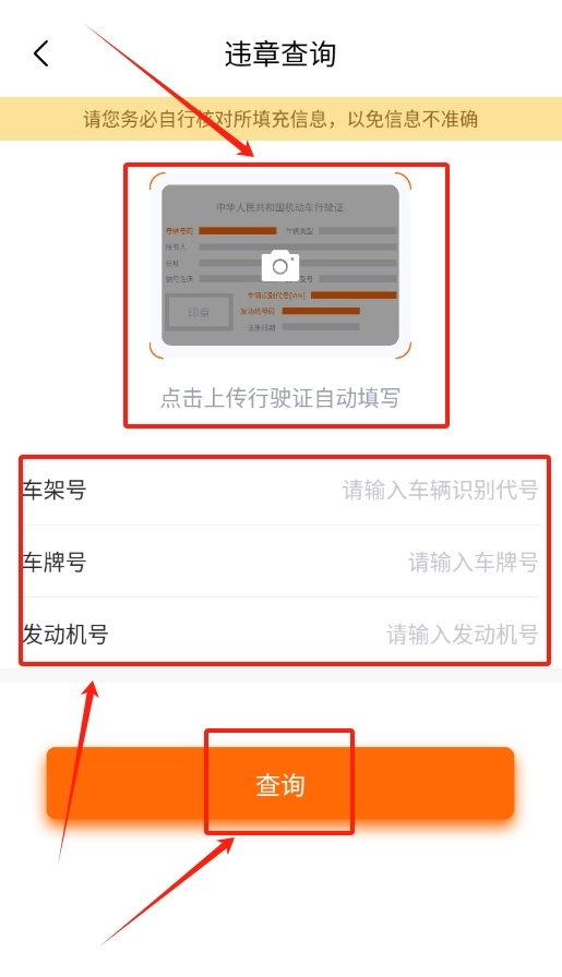 在查询页面,您可以输入车架号、车牌号与发动机号;若不想手动输入,上传行驶证即可自动填充这些信息。