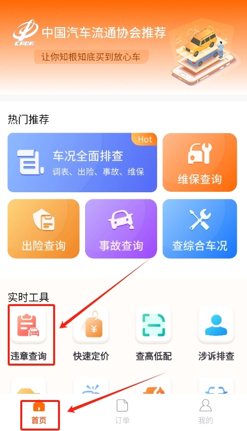 登录成功后回到首页,找到违章查询的入口,直接点击进入准备查询违章。