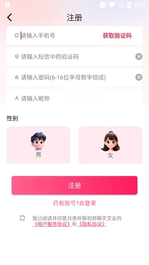 打开你的月夜伴聊视频聊天交友App,点击进入登录页面。