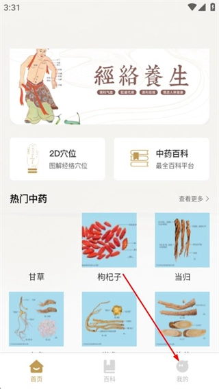 进入中医穴位图界面后,点击底部导航栏中的“我的”选项,即可进入个人中心页面。
