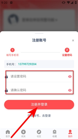进入设置密码的页面,设置好密码后,点击“注册并登录”按钮,就能完成账号的注册流程了。