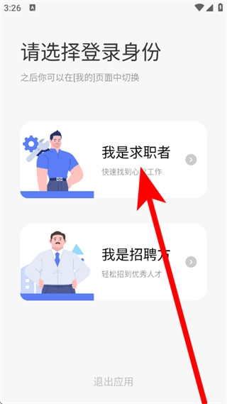 在登录身份选择界面,点击“我是求职者”选项,即可进入手机号登录注册页面。