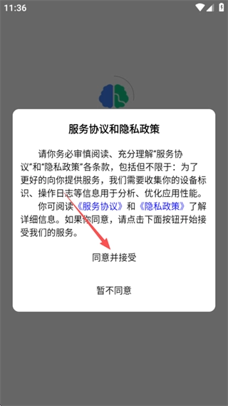 打开应用程序后,在弹出的协议窗口里点击同意并接受按钮,就能进入登录界面。