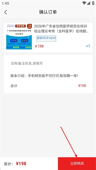 在确认订单页面,核实相关信息后点击立即购买按钮,就能完成这份试卷的购买流程。