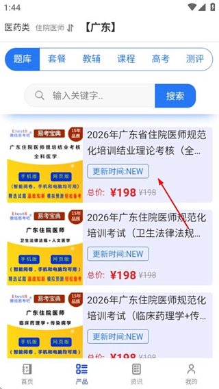 进入易考宝典后,点击底部的产品选项,即可进入产品页面。