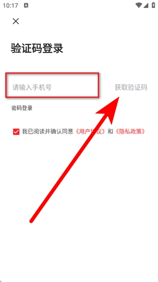 在验证码登录页面,先输入手机号,接着勾选同意相关协议,然后点击获取验证码按钮。