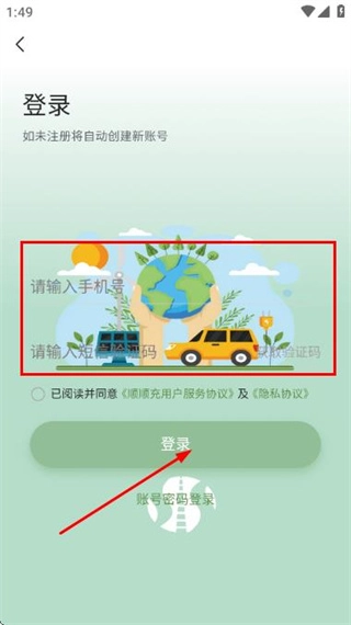 在登录界面输入手机号与短信验证码,勾选相关协议后,点击登录按钮即可完成账号登录流程。