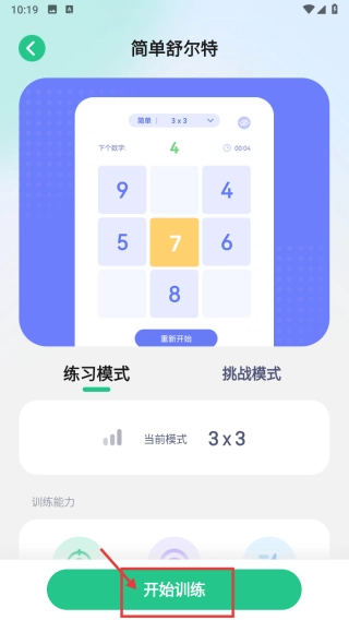 在训练分类页面,点击简单舒尔特分类图标,即可进入简单舒尔特训练页面。
