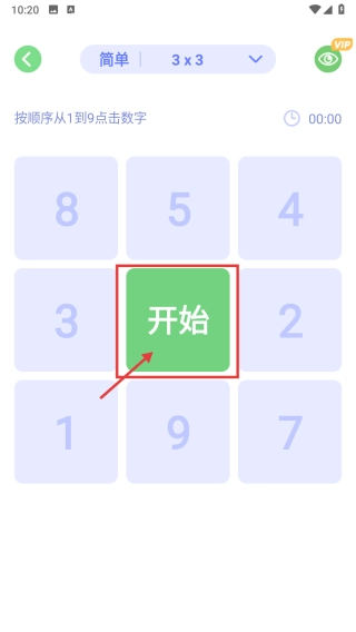 在专注力训练的准备界面中,点击“开始”按钮后,按1至9的顺序依次点击数字,即可启动训练。