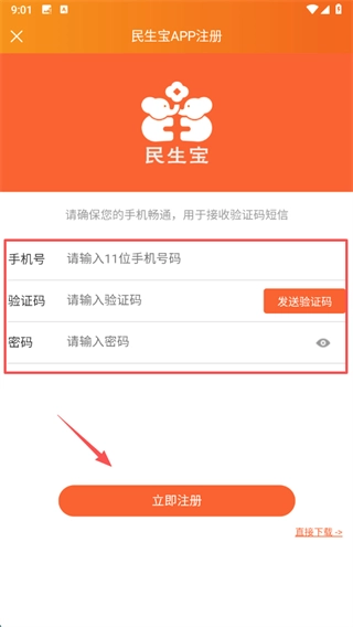 在民生宝的注册界面,依次填写手机号、验证码与密码,随后点击“立即注册”按钮,即可完成账号的注册流程。