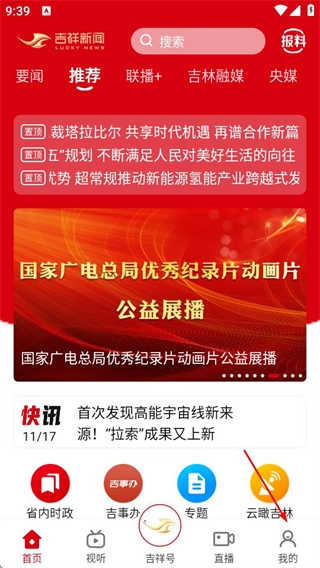 在吉林融媒的首页,找到右下角的“我的”选项并点击,即可进入个人页面。