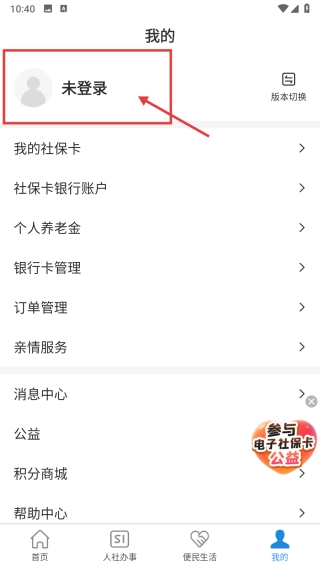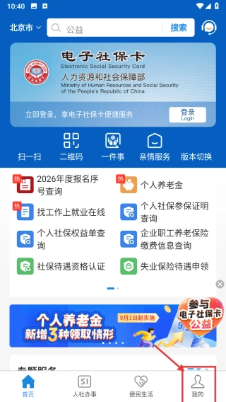 打开社保服务类别,点击底部的“我的”选项,进入个人中心页面。