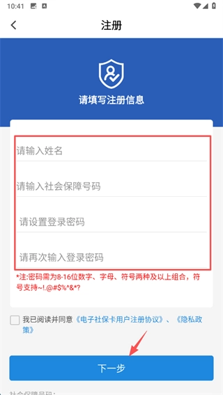在注册信息填写页面,按照顺序输入姓名、社会保障号码,设置登录密码并再次确认该密码,勾选相关协议条款后点击“下一步”按钮,即可完成账号的注册流程。
