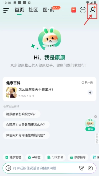进入健康服务分类,点击右上角的个人中心图标,即可进入个人页面。