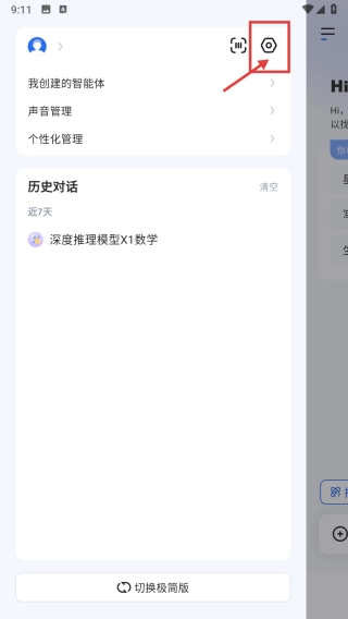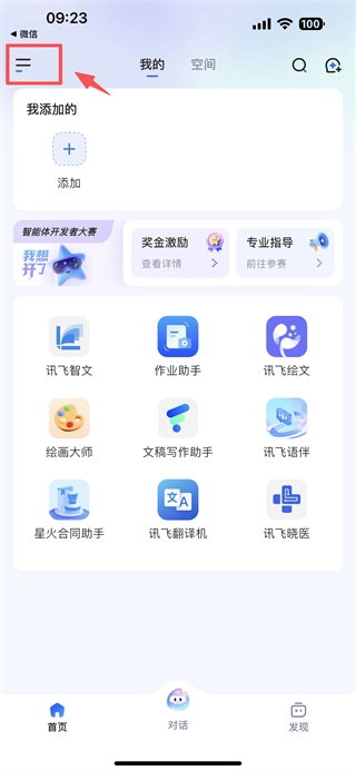 打开智能助手类别,点击左上角的菜单图标,展开功能菜单。