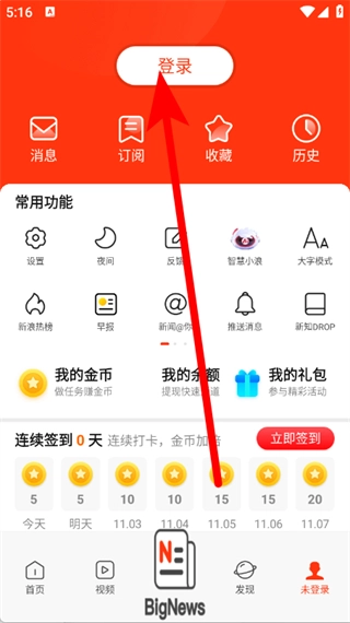 打开新浪新闻应用,点击底部导航栏中的“未登录”选项,即可进入个人页面。