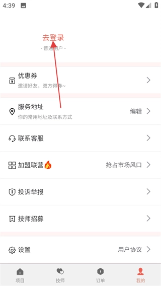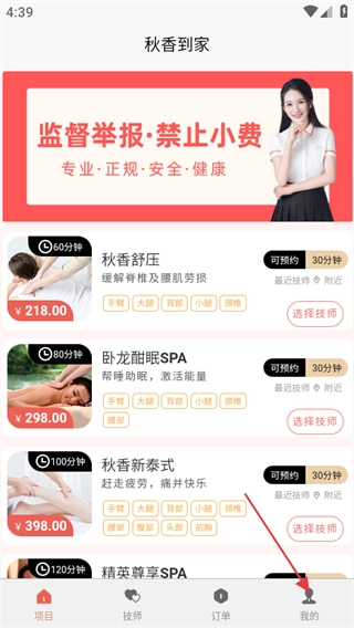进入秋香到家后,先找到项目页面,接着点击底部的“我的”选项,就能进入个人页面了。