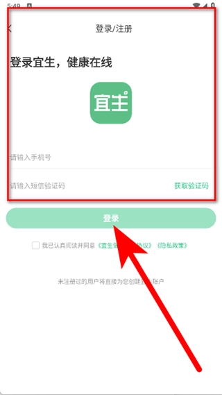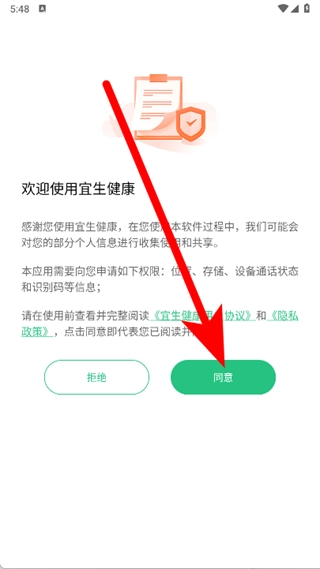 打开宜生健康,在欢迎页面点击同意。