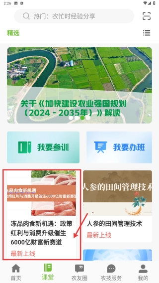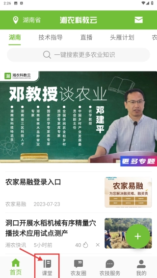 打开湘农科教云应用,点击底部导航栏中的“课堂”选项,即可进入农业课程精选页面。