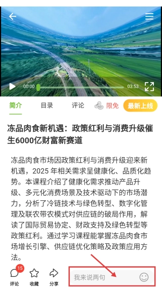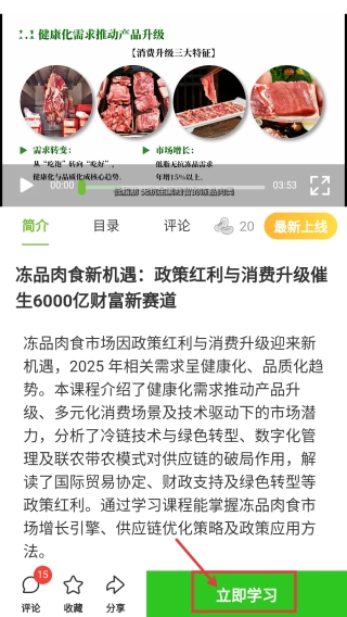 在课程精选页面,找到并点击“冻品肉食新机遇:政策红利与消费升级催生6000亿财富新赛道”这一课程条目,即可进入该课程的详情页面。
