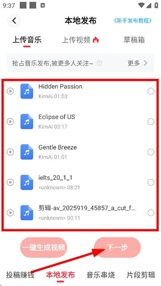 挑选好想要发布的音乐后,点击“下一步”按钮,就能进入到作品发布的编辑界面了。