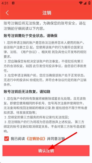 在注销说明页面点击确认注销按钮,即可执行账号注销操作。
