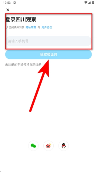 进入四川观察的登录页面,勾选相关选项后,输入手机号码,再点击获取验证码按钮。