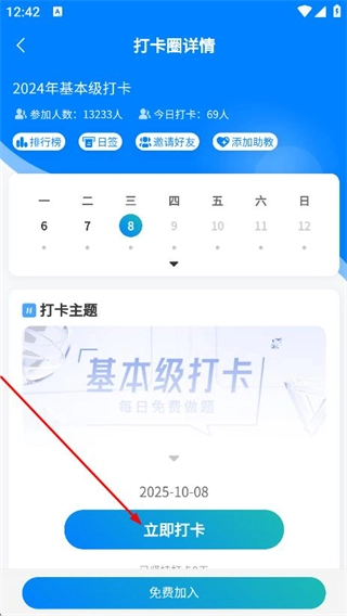 在打卡圈的详情页面中,点击“立即打卡”按钮,即可进入打卡学习的页面。