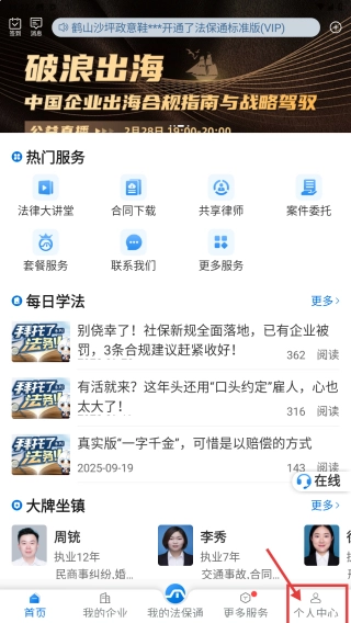 打开法律类服务应用后,点击底部的“个人中心”选项,即可进入个人中心页面。
