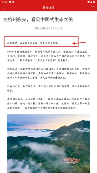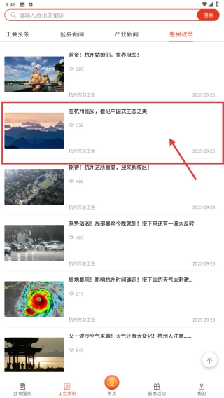 在惠民政策新闻列表里,找到那篇关于杭州临安展现中国式生态之美的目标新闻,然后点击进入新闻详情页面。