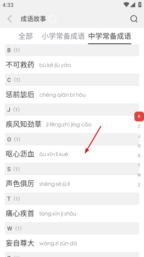 在成语故事页面,点击“中学常备成语”选项,即可查看中学常备成语的具体列表。