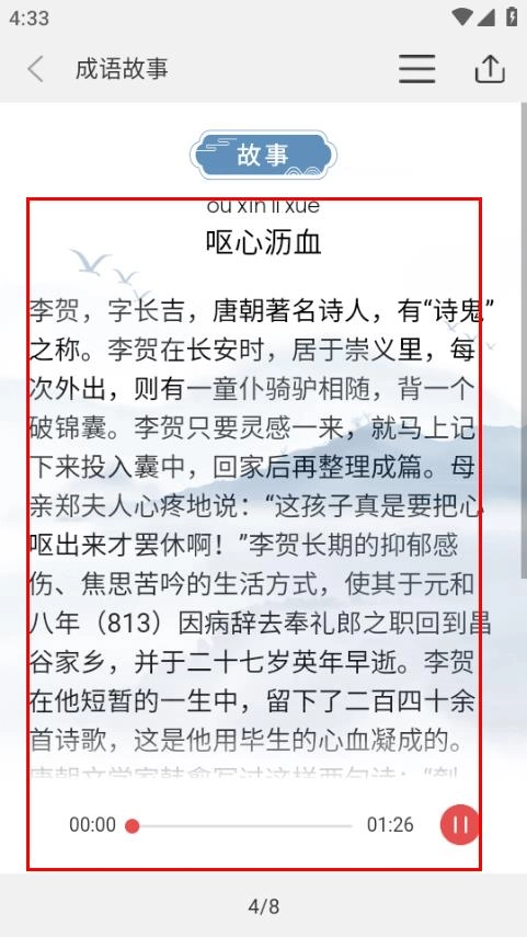 在这个成语故事页面,您可以查看“呕心沥血”的故事内容,还能收听对应的音频。