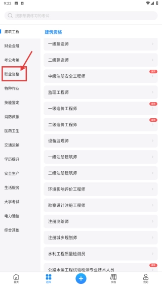 在题库页面,点击职业资格选项,进入职业资格分类列表。