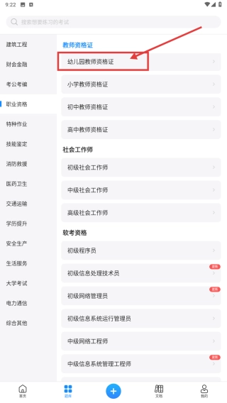 在分类列表中,找到幼儿园教师资格证相关条目,点击该条目进入对应的学习页面。