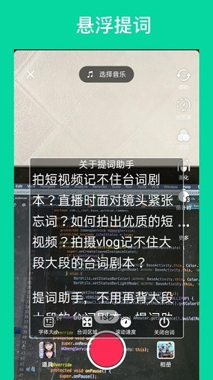 拍短视频总记不住台词剧本?直播面对镜头就紧张忘词?怎样才能拍出优质的短视频?录制vlog时大段台词剧本记不住怎么办?提词助手这款口播直播悬浮提词器软件,可是专业的滚动提词工具,不管是直播、短视频口播录制都适用,是UP主和自媒体人的必备神器,也是实用的直播辅助工具、vlog制作辅助工具,一部手机就能彻底帮你解决忘词的烦恼!