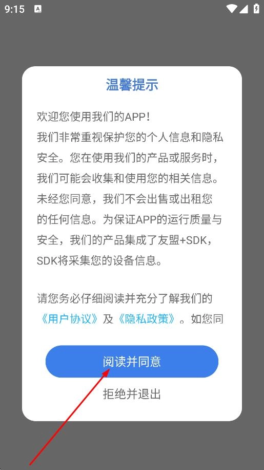 在温馨提示弹窗里,点击“阅读并同意”,就能进入应用的主页面啦。