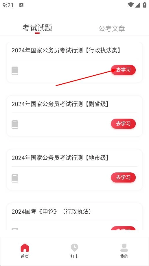 在主页面找到2024年国家公务员考试行测行政执法类相关内容后,点击其右侧的“去学习”按钮即可。