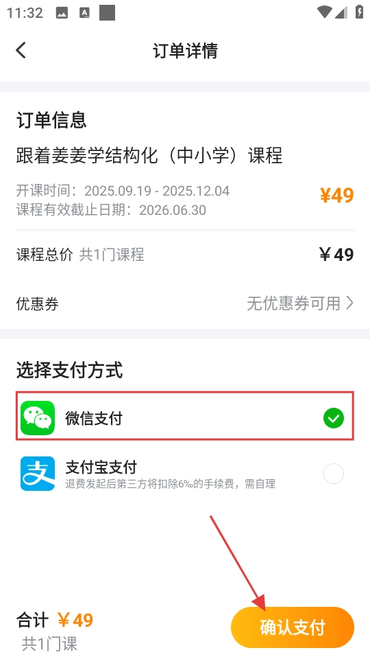 在订单详情页面,选好支付方式后,点击确认支付按钮,就能完成课程的购买流程。