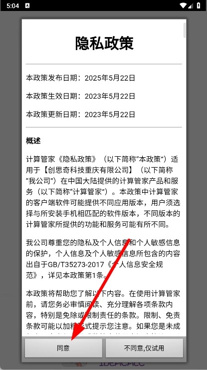 打开后,当弹出隐私政策提示框时,点击“同意”按钮。