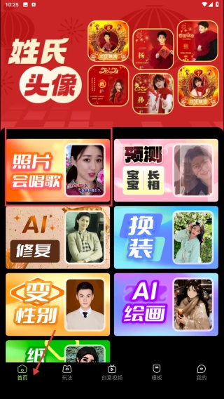 进入首页后,您可以使用姓氏头像、照片会唱歌、AI修复等功能,还能体验换装、变性别、AI绘画等有趣的玩法。