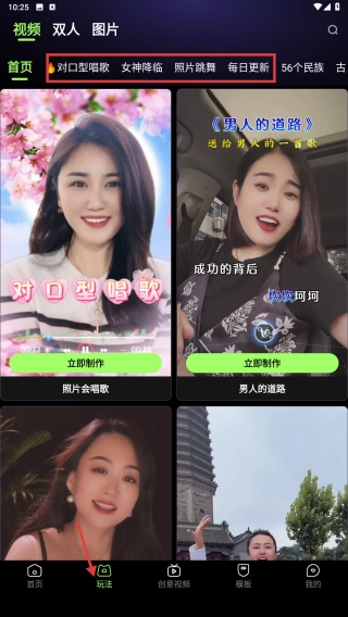 切换至创意视频页面,便能制作对口型唱歌、医生视频等多种类型的创意视频。