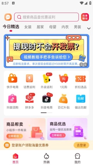 淘全是一款整合全网优惠资源并支持分享赚钱的手机应用,它汇集了淘宝、京东、拼多多、抖音等主流电商平台的海量商品,借助精选推荐、满减专区、百亿补贴等精准分类板块,让用户能一站式领取超值优惠券,达成购物省钱的目的;同时,它还创新推出零成本帮卖模式,用户无需囤货,就能轻松推广商品赚取佣金。